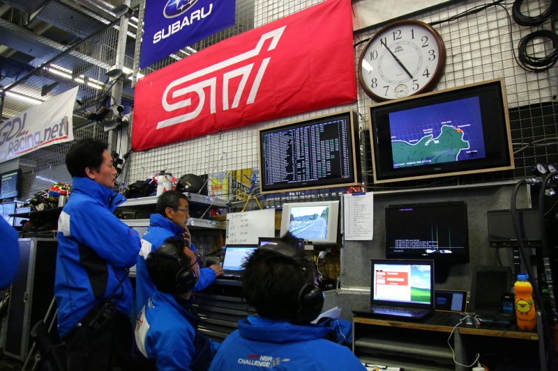 正午を迎え、24時間レースはいよいよ残すところあと4時間となりました。ピットでは平川良夫STI社長を始め、エンジニア達がモニターを睨み、レースの行方を追っています。ライバルとのタイム差や燃費予測、区間タイムデータ蓄積、ピンポイント天気予測、レースカーとピットとの無線交信などを総合し、小澤正之STI監督がレース運営を指揮します。スタートから20時間を経過し、寝ずの対応で疲労蓄積は飽和状態のはずです。それでも車両に細かな異常データがないか、ライバルが急接近していないか、データチェックは続きます。#114 WRX STIはこの時点で総合21位、クラス1位、118周を完了しています。