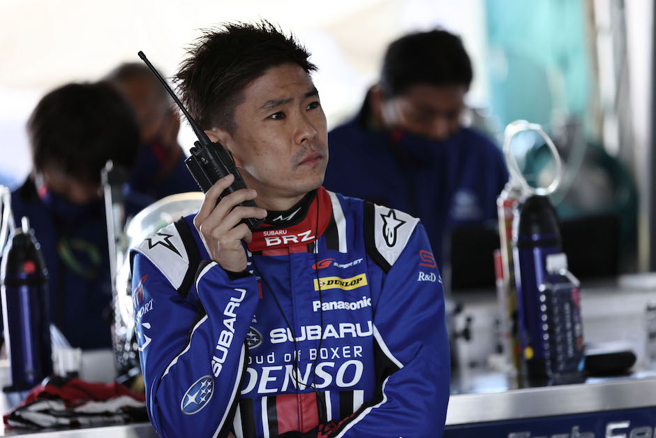 岡山の公式テストでは、主催者から指定された性能調整(BoP)ウェイト50kgとさらに特別調整分として35kgのウェイトを搭載しながら、速さを見せていたBRZ GT300ですが、今回の富士ではBoP分50kgのほか、岡山でポイント獲得することを想定して若干のサクセスウェイト分を積んでの走行となりました。そのため、初日はタイムが伸び悩んだようです。STIの小澤正弘総監督は、「初日はとにかくタイヤの組み合わせ試行を繰り返し、ダンロップさんに準備していただいたタイヤにどうクルマを合わせるかに集中しました。セッションは時々赤旗中断がありましたが、持ち込んだ10セットのドライタイヤのうち、大部分を使ってテストができました」と語っています。