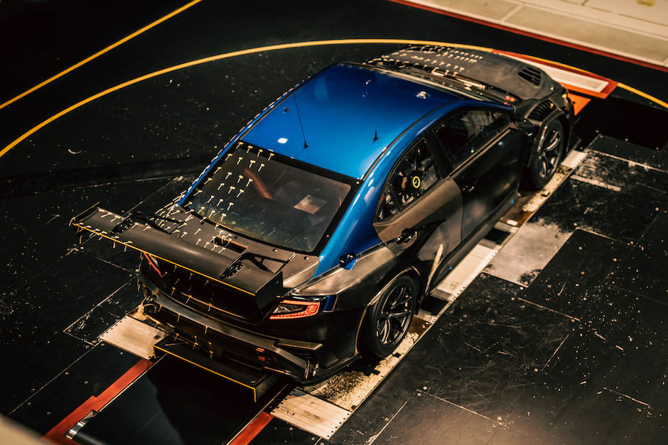渋谷プロジェクトマネージャーは、「VB型は、VA型に比べてAピラーの傾斜角が寝ており、CD値(空気抵抗)の点では有利です。さらに、フロントフェンダー形状や2022年車で実績のあるスワンネック式リヤウィングが効果的であることはわかっていました。まずはCFDを使って導風の検討を始めました。CAD(コンピューター)上で設計した外装パーツを組み付けたのち、2022年10月にはSUBARU群馬製作所内にある風洞設備で実車試験を実施しています。そこで、目標性能が実車で発揮できているかを確認しました。その結果からフロントのダウンフォースが想定よりやや不足していることがわかりました。また、その後富士スピードウェイで行った開発テストでは、ドライバーからも同様のコメントがあり、対策が必要となりました。風洞試験も以前のモデルから幾度となく繰り返していますが、データを蓄積していくたびに実車と解析の相関が取れて精度が上がり、数値とドライバーのフィーリングとがマッチしてくるものです。