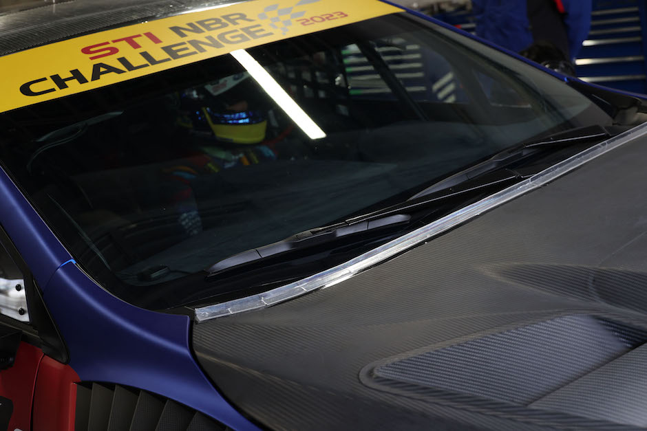 STIで長く外装部品の設計に関わってきた山内大生が、最初の開発テストの際に「今回の新車は、これまでと違いSTIの若手技術者の多くが設計に関わり、またSUBARUの技術者の協力も得られたので、短期間でかなり精度の高い外装部品の開発ができました。そのため、軽量化や空力性能だけでなく、サーキット現場でのサービス性も考慮したもの作りができています。例えばフロントノーズアッセンブリのクイック着脱機能がそれですし、ドアのカーボン製内張ひとつにしても最初からドアハンドルなど必要な機能が作り込めているので、走らせながら部品を追加していく必要はありません。また、ドライバーの快適性を考えて導風をレイアウトしているのもこれまでの蓄積技術の活用です。フロントグリルも冷寒時用、ドライビングランプを組み込んだ夜間用など3種類がシェイクダウン時に用意できました」、と笑顔で話していたのが印象的でした。