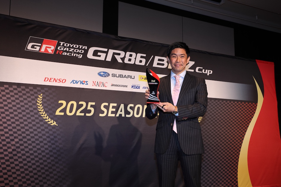 12月19日(金)、静岡県の富士スピードウェイホテルで、「TOYOTA GAZOO Racing GR86/BRZ Cup2025」のシリーズ表彰式が行われ、シリーズランキング2位を確定したTeamTakuty 88号車の井口卓人(ブリヂストン)が登壇しました。