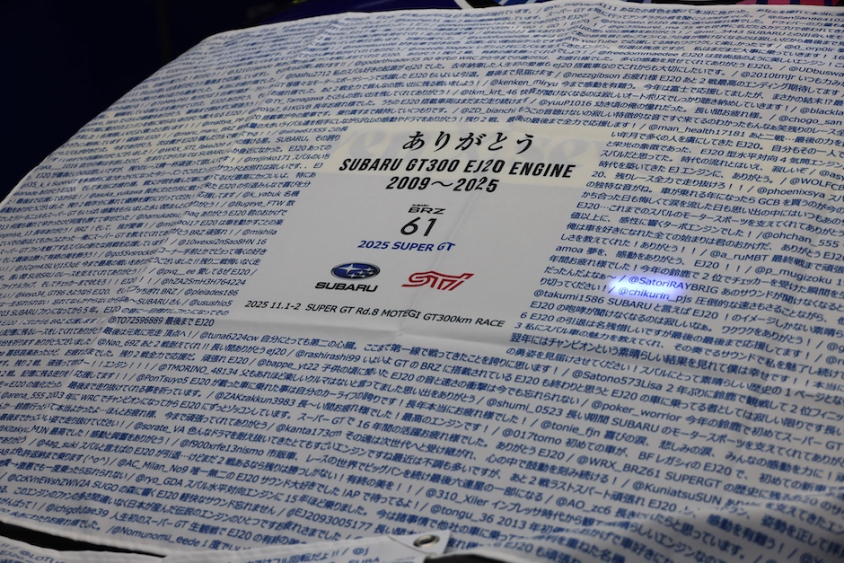 本年のSUPER GTシーズンは最終戦もてぎで幕を下ろしました。困難の多いシーズンとなってしまいましたが、最終戦では予選ポールポジション、決勝レースでもトップに迫る2位表彰台で終えることができ、このレースをもって引退することが決まっているEJ20型2.0L水平対向ターボエンジンの送り出しに相応しい内容となりました。