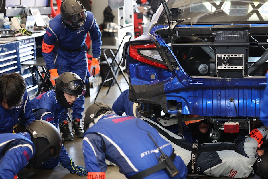 13時丁度にスタートした第1グループに続いて、第2グループは13時5分にスタートしました。しかし、ここで88号車に不運なアクシデントが発生します。第一コーナーを右に曲がって続く左ターンに入るところで後続車にリアをヒットされた88号車は、スピンして停車してしまいます。その後再スタートして佐々木は、オールドコースに入って行きましたが、リア部の損傷によりボディパーツがバタバタするため、1周回ってピットイン。損傷したリアバンパーとディフューザー、エキゾーストパイプを修理することとなりました。佐々木によると、サスペンションなど走行に関わる部分には問題が無いとのこと。約45分間の修理を経て、コースに戻すことができました。この時点で88号車は、最後尾の108位にまで順位を落とし、トップからは既に5周差をつけられています。佐々木は、ハイペースで前走車を追い、8周後には101周まで挽回し井口にバトンを渡します。コースインした井口も失地挽回のためペースを上げますが、交代して間も無く、「4速以上にシフトアップすると異音がする」、と訴えてピットイン。エンジニアが確認すると、4速ギアに問題があるようです。4速を使わずに残り周回を走破する決断を下して、井口はコースに戻ります。井口は、その状態でも速いペースを維持し続け、レース終盤には9分を切るラップタイムで走行。17時のチェッカーフラッグまで我慢の走行を続け、一時クラス3位まで落とすものの、最終的には総合88位SP4Tクラス首位でレースを終えることができました。