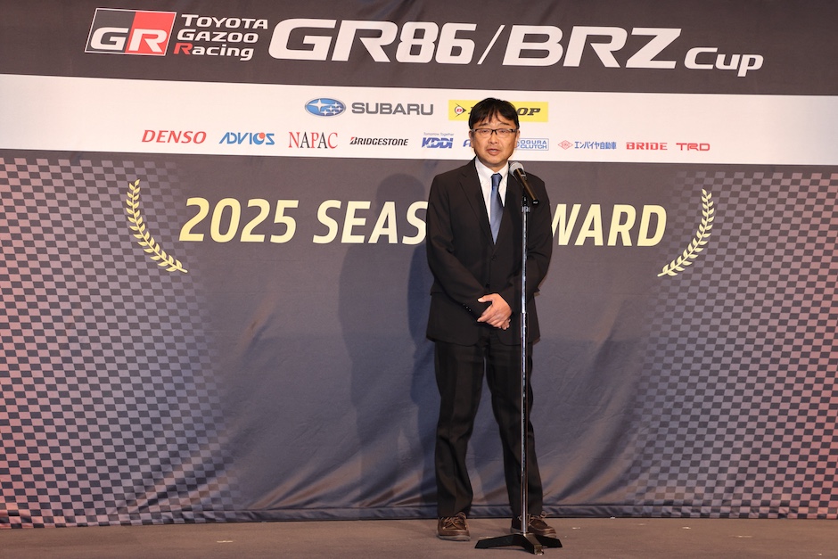 12月19日(金)、静岡県の富士スピードウェイホテルで、「TOYOTA GAZOO Racing GR86/BRZ Cup2025」のシリーズ表彰式が行われ、シリーズランキング2位を確定したTeamTakuty 88号車の井口卓人(ブリヂストン)が登壇しました。