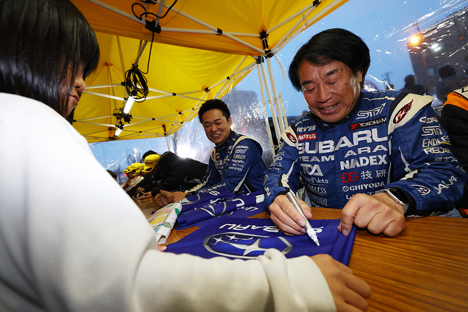 ラリーは2月27日(金)の夕方、JR蒲郡駅南口の特設会場でセレモニアルスタートを実施。選手権トップクラスのドライバーたちが揃ったサイン会には、新井/安藤組の席にもファンが長い列を作り、人気の高さを窺わせました。競技は翌28日(土)から、愛知県蒲郡市のラグーナテンボスに設置されたサービスパークを拠点にスタート。この日は、サービスパークから徒歩圏内のダートコースや、ショートコースと林道が組み合わされた9SS・38.84kmが設定されました。