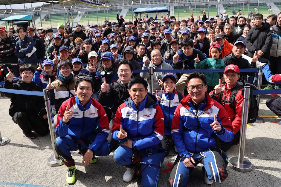 3月7日(土)は好天に恵まれ、朝から多数のレースファンが岡山国際サーキットに集まってきました。気温は前日同様11℃で、暖かい日差しが気持ち良いものの、雲によって陽が遮られると肌寒い天候です。朝9時からのセッション3は、山内英輝がピットアウト。走り出して80分ほど経過した後に赤旗が提示され、コースアウトした車両を排除するためにセッションは中断となりました。そのため、走行時間は20分間延長されることに。リスタート後に山内がコースに戻りましたが、トラブルなく3回目のセッションを無事終了しました。12時間からのピットビューイングには、観客がピットレーンに入ることができ、お気に入りのドライバーに接近することができます。ここでもSUBARU人気は高く、多くのファンが足早にピット前に駆けつけ、ドライバーが現れるのを待っています。兵庫県から親子で来られたファンの方は、「2時間かけてサーキットにやってきました。SUBARUドライバーにサインしてもらうため、ピットビューイングの列に1時間半ほど待ちましたが、フロントロウが取れて嬉しいです」、と語っていました。